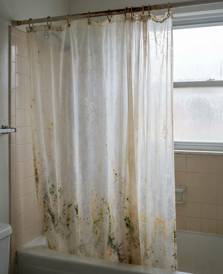 Der Hauptschuldige ist vor allem Feuchtigkeit. Nach jeder Dusche bleibt der Vorhang nass und von Dampf umgeben. Schimmel liebt das und wächst rasend schnell. Zähle dazu Schichten aus Seifen- und Shampooresten sowie Kalkablagerungen aus hartem Wasser – und du hast den perfekten Nährboden für Flecken.